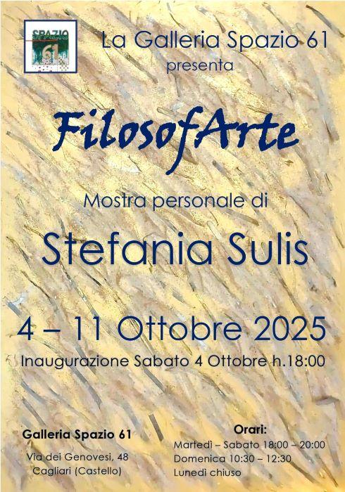 Sabato 4 Ottobre 2025 la Galleria Spazio61 inaugura la mostra personale di Stefania Sulis dal titolo “FilosofArte”. Intentodell’artista è quello di evidenziare il connubio tra pittura e filosofia: unlegame antico e profondo, dove l'arte visiva diventa un veicolo per esprimereconcetti filosofici e, viceversa, la filosofia fornisce strumenti perinterpretare e comprendere le opere d'arte.